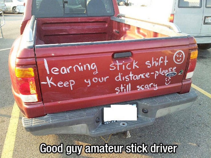 5. Cet automobiliste débutant qui a pris soin d'avertir les gens autour qu'il n'était pas encore tout à fait à l'aise avec les changements de vitesse (leur demandant donc de garder leurs distances)