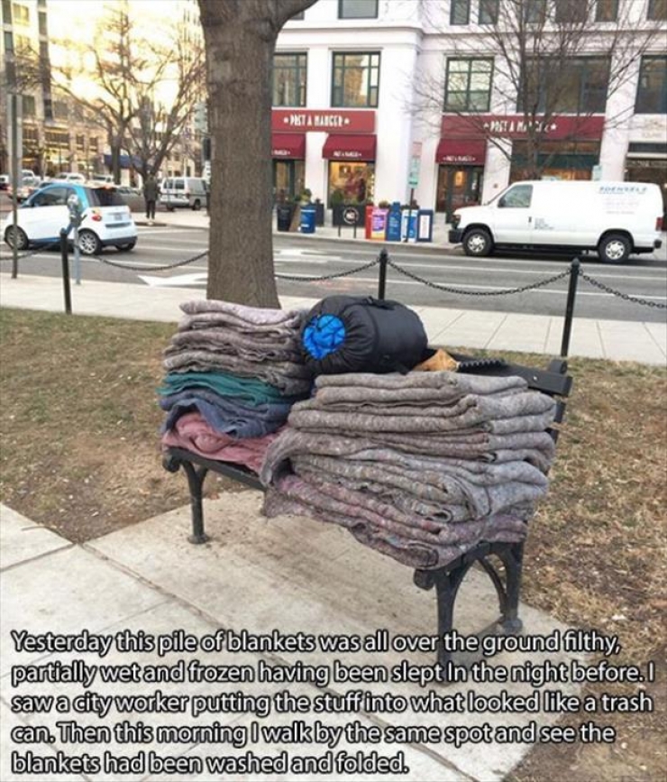 9. Cet employé municipal qui a lavé, séché et plié des couvertures sales et humides qu'il a trouvées dans ce parc (appartement probablement à un sans-abri)