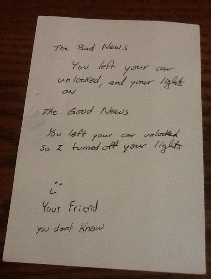 11. Cet anonyme qui a trouvé une voiture ouverte avec les feux allumés et qui les a éteints. Le propriétaire du véhicule a ainsi évité une panne de batterie grâce à lui