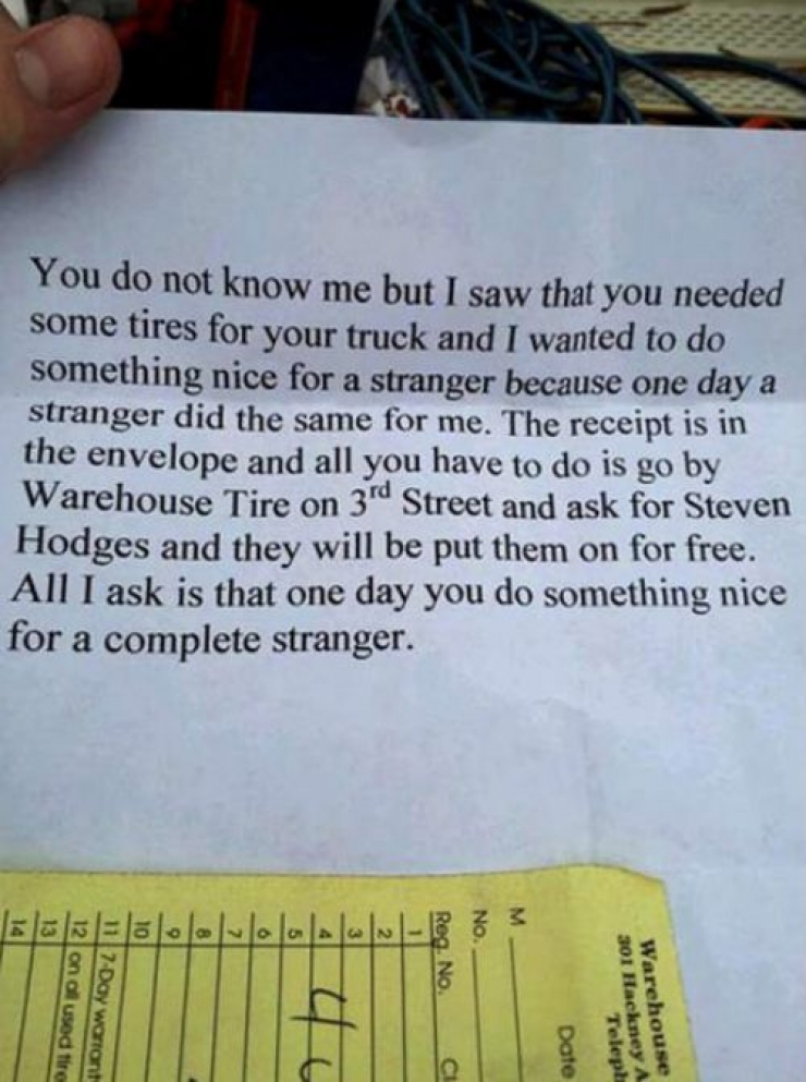 13. Cet anonyme qui a offert de nouveau pneus au propriétaire d'un camion qui en avait visiblement besoin, lui laissant une enveloppe dans laquelle il avait glissé le reçu et l'adresse du magasin où il les a achetés et payés. La personne y explique également qu'elle a agi ainsi car un autre anonyme lui avait rendu service par le passé, et qu'il espère que le propriétaire du camion en fera de même un jour