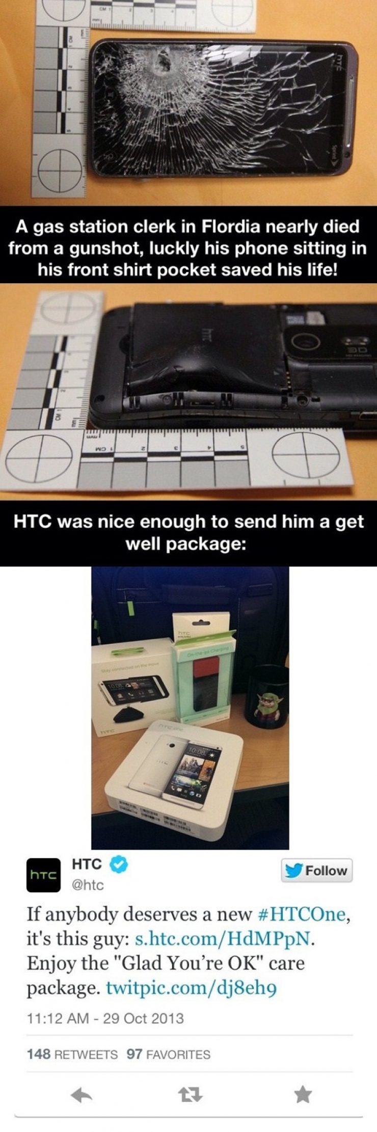 16. Ce geste de la firme HTC qui a offert un package à un employé de station-service dont le smartphone de la marque a miraculeusement stoppé la balle qui lui a été tirée dessus, lui sauvant la vie
