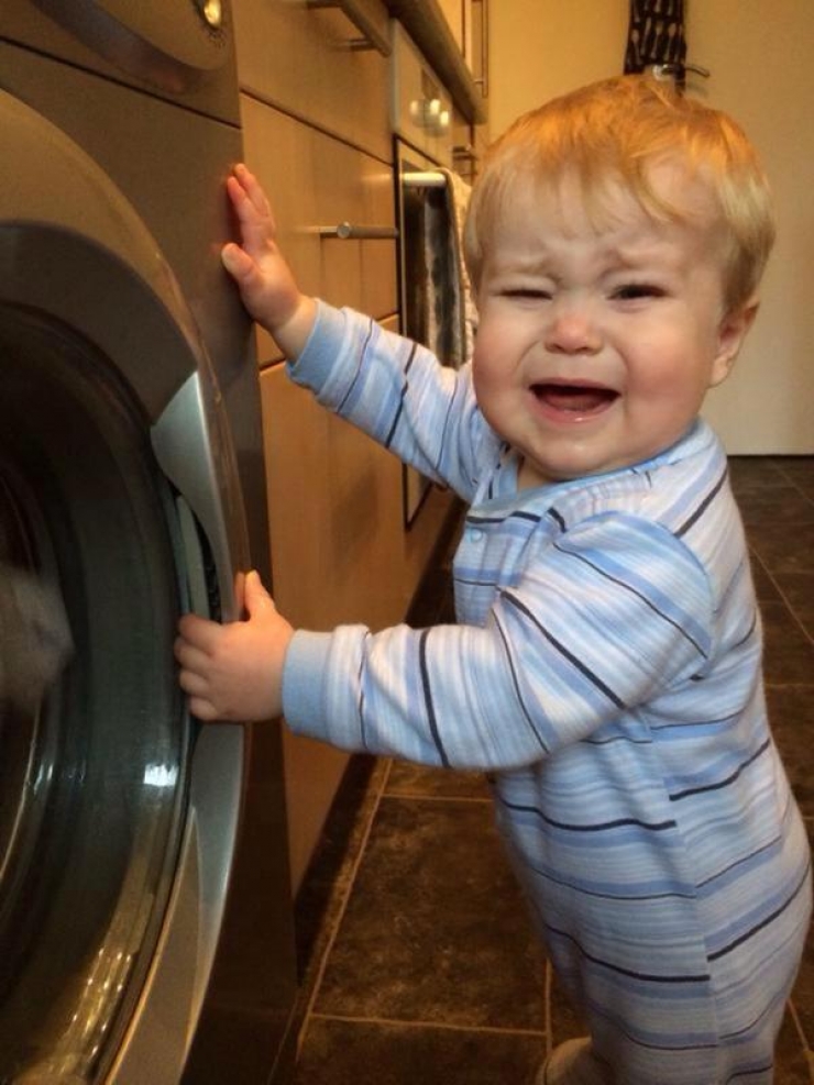3. Il n'arrive pas à croire que son chien en peluche soit enfermé dans le lave-linge