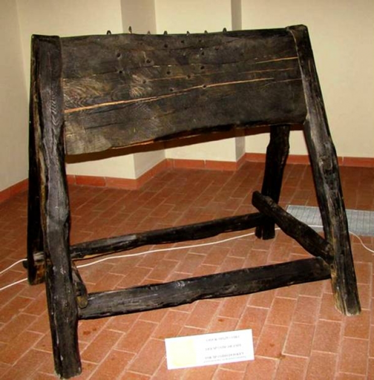 Des prisonniers de l'Inquisition espagnole étaient placés nus, avec des poids aux pieds, sur ce genre de portique en bois doté de piques métalliques.