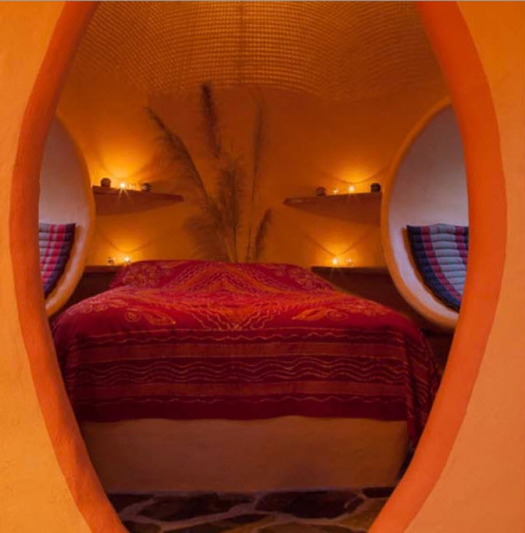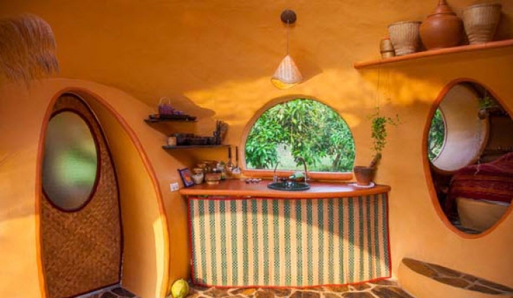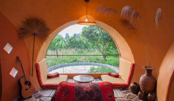 Cette maison à la forme étrange dispose de tout l'équipement classique (chambre à coucher, cuisine, salle de bain...), mais elle est en plus totalement intégrée à la nature, avec son bassin, ses grandes ouvertures et les matériaux écologiques qui la composent.