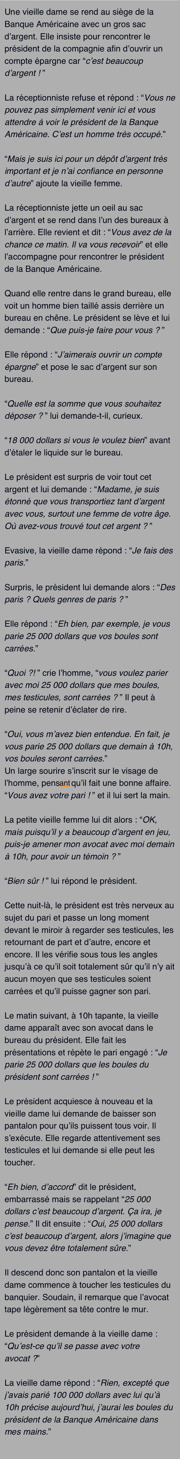 Cette mamie, par exemple, est bien décidée à rencontrer le président de la Banque Américaine en personne pour, a priori, lui confier ses économies. Mais plutôt que de lui remettre son pécule, c’est un défi totalement inattendu qu’elle lui propose. Et le moins que l’on puisse dire, c’est que cette grand-mère n’a pas froid aux yeux.
