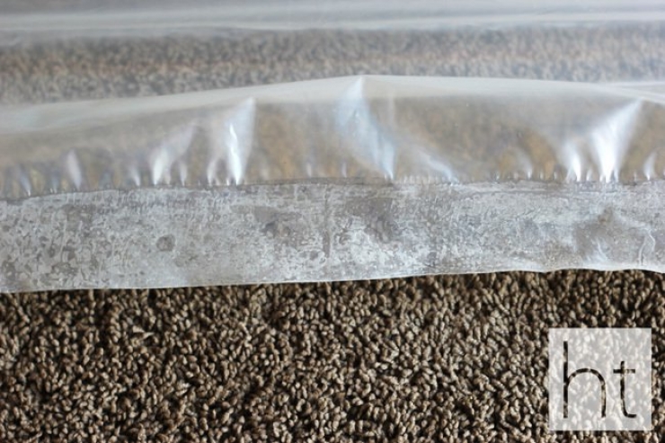 Étape 2 : Il est l’heure de souder. Vous allez devoir commencer par le côté de plastique qui est opposé au pli et ce en commençant par le coin. Dépliez le papier sulfurisé et placez votre bâche en plastique à l’intérieur, en l’alignant sur le pli du papier sulfurisé.