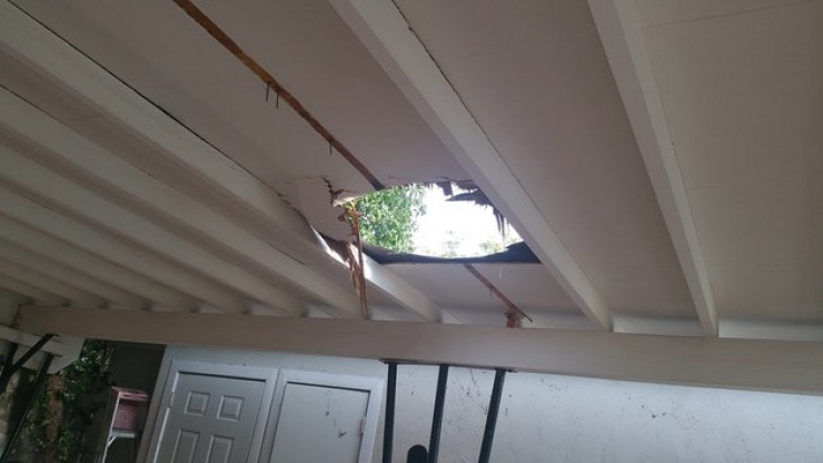 Le lendemain elle s’est rendue compte qu’un paquet était tombé sur son toit, faisant un trou dans ce dernier et atterrissant sur la cage de son chien.