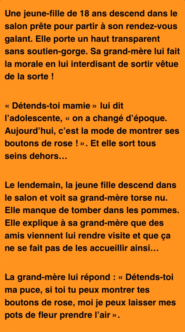 La preuve avec cet échange entre une mamie et sa petite-fille. Admirez l’excellente réponse donnée par la grand-mère à la jeune fille de 18 ans qui lui reprochait son côté « vieux jeu »…