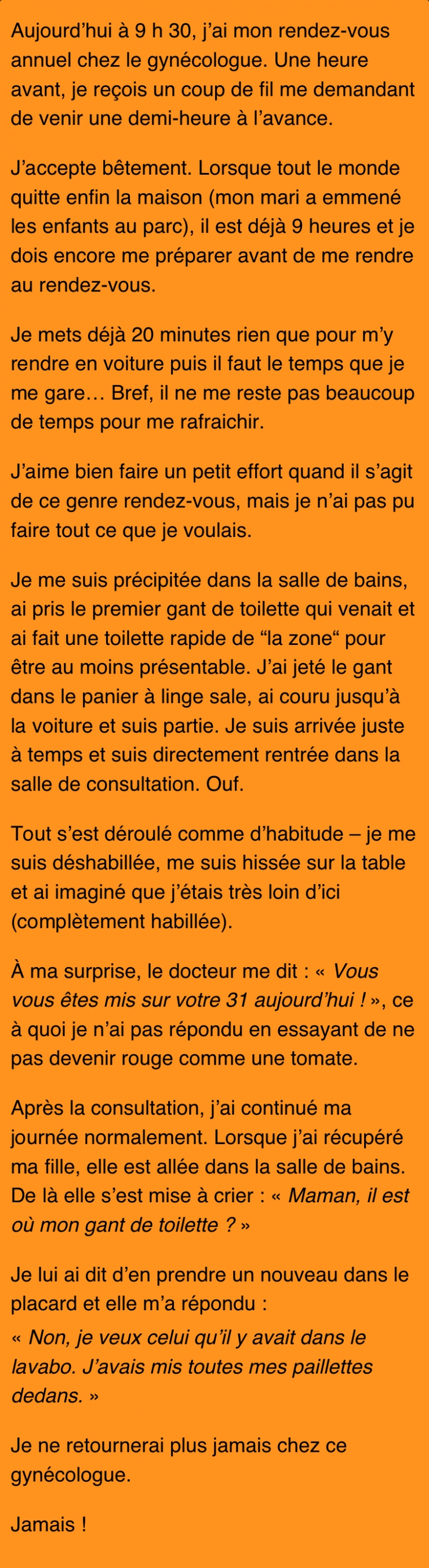 C’est ce que vit la femme dont on découvre ici la drôle d’histoire. Alors qu’elle est pressée et qu’elle doit se rendre chez son gynécologue, on l’appelle pour lui demander d’y aller plus tôt que prévu.