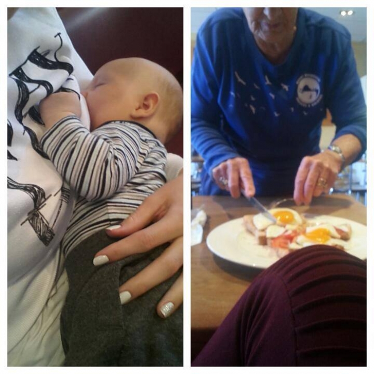 “Aujourd’hui, pour la première fois, je suis sortie prendre mon petit-déjeuner seule avec mon fils de 8 semaines. On venait juste de me servir mon petit-déjeuner et mon chocolat chaud quand Jaxon a commencé à pleurer pour avoir sa tétée, alors bien sûr, je l’ai nourri.
