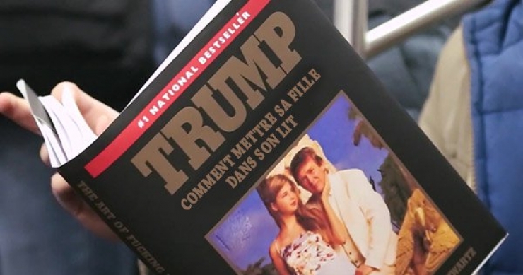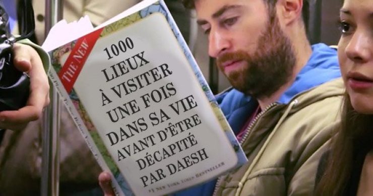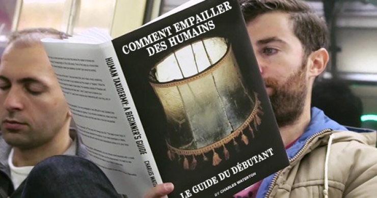 En effet, celui-ci tient dans ses mains des livres intitulés '101 astuces pour allonger son pénis', ou ' Comment empailler un être humain : le guide pour débutant' ou '1 000 endroits à voir avant d’être exécuté par l’État Islamique' ou encore 'Comment retenir un pet ? '…