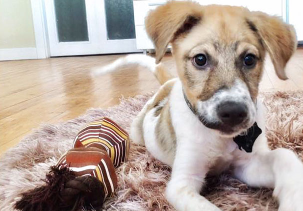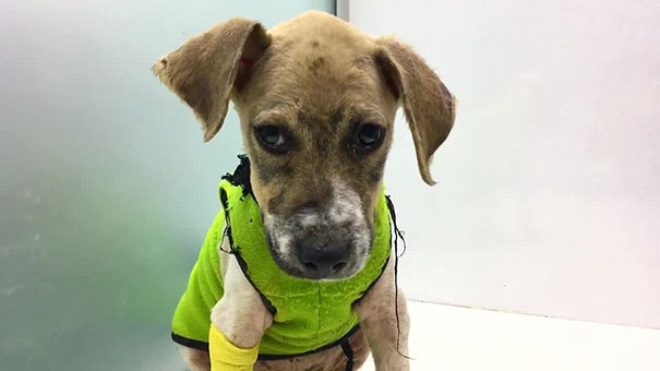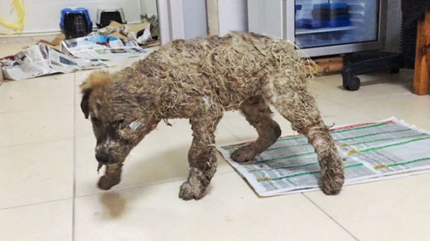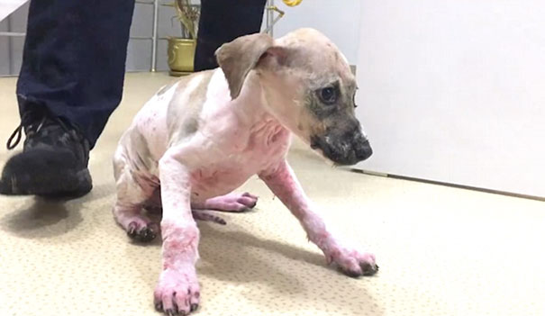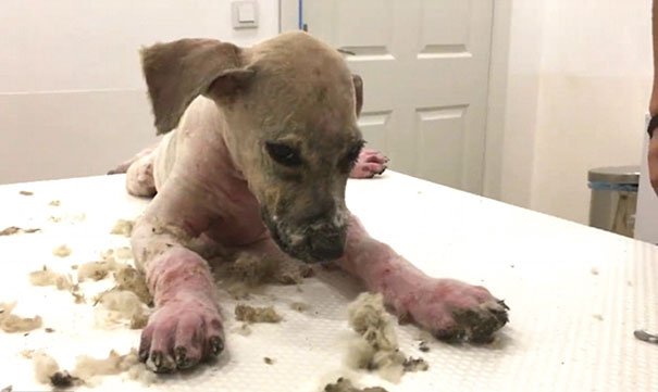 L'équipe de secours a complètement rasé le chien et à cause des produits chimiques, sa peau a subi de lourds dégats
