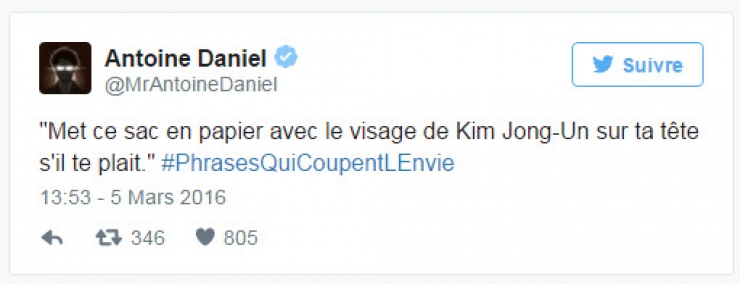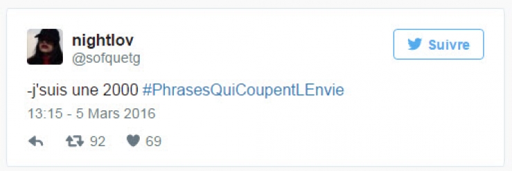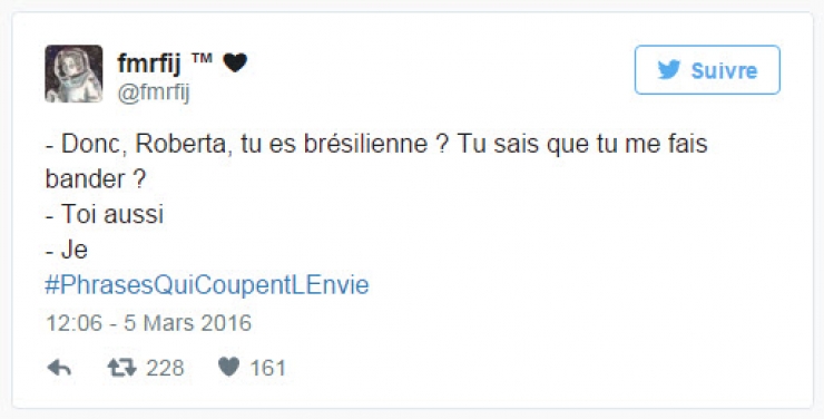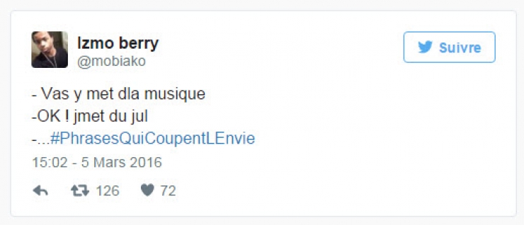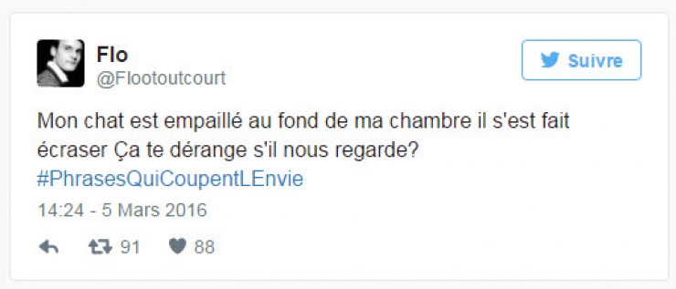 De nombreux utilisateurs de Twitter s’en sont, en effet, donnés à cœur joie avec ce hashtag #PhrasesQuiCoupentLEnvie lancé sur le réseau social. Comme son nom l’indique, il s’agit d’imaginer les phrases qui interrompent toute envie de câlin, notamment en suscitant le dégoût chez l’autre.