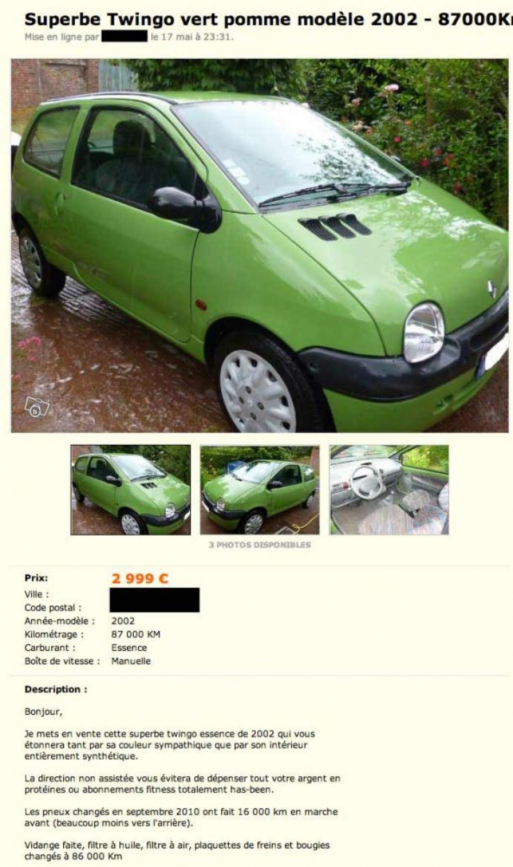 Dans l’exemple qui suit, un monsieur qui ne manque pas d'humour met sa voiture en vente en y intégrant une description qui sort de l’ordinaire. Le mec n’a laissé aucun détail de côté quitte à mentionner les 4 roues ou encore le moteur! On comprend donc pourquoi cette annonce très inhabituelle a enflammé la toile.