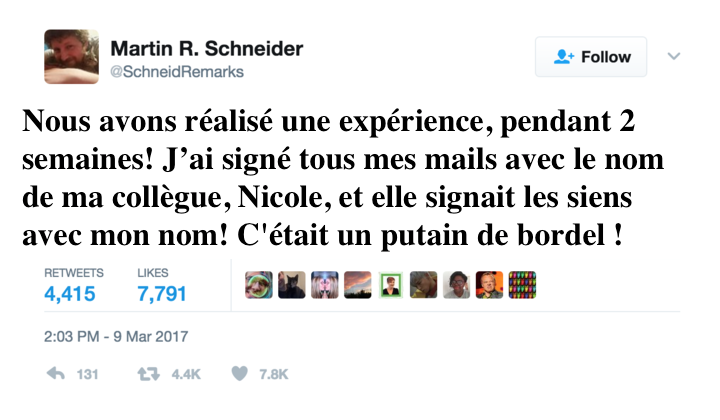 Nous avons alors fait une expérience : pendant deux semaines, on a échangé nos noms. J'ai signé tous mes mails aux clients en tant que Nicole. Elle signait en tant que moi. Les gars... C'était vraiment horrible.