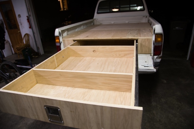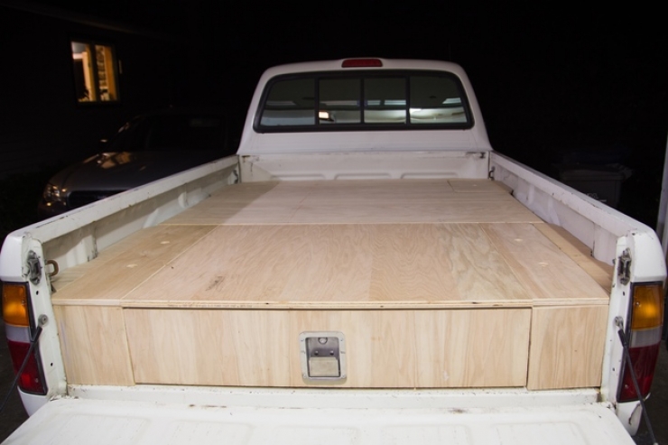 Et voilà le travail ! Un lit douillet, des haut-parleurs et un grand tiroir coulissant pour y entreposer ses vêtements, matériel de camping et tout ce dont il a besoin pour ses activités de baroudeur. Pas cool ça ?