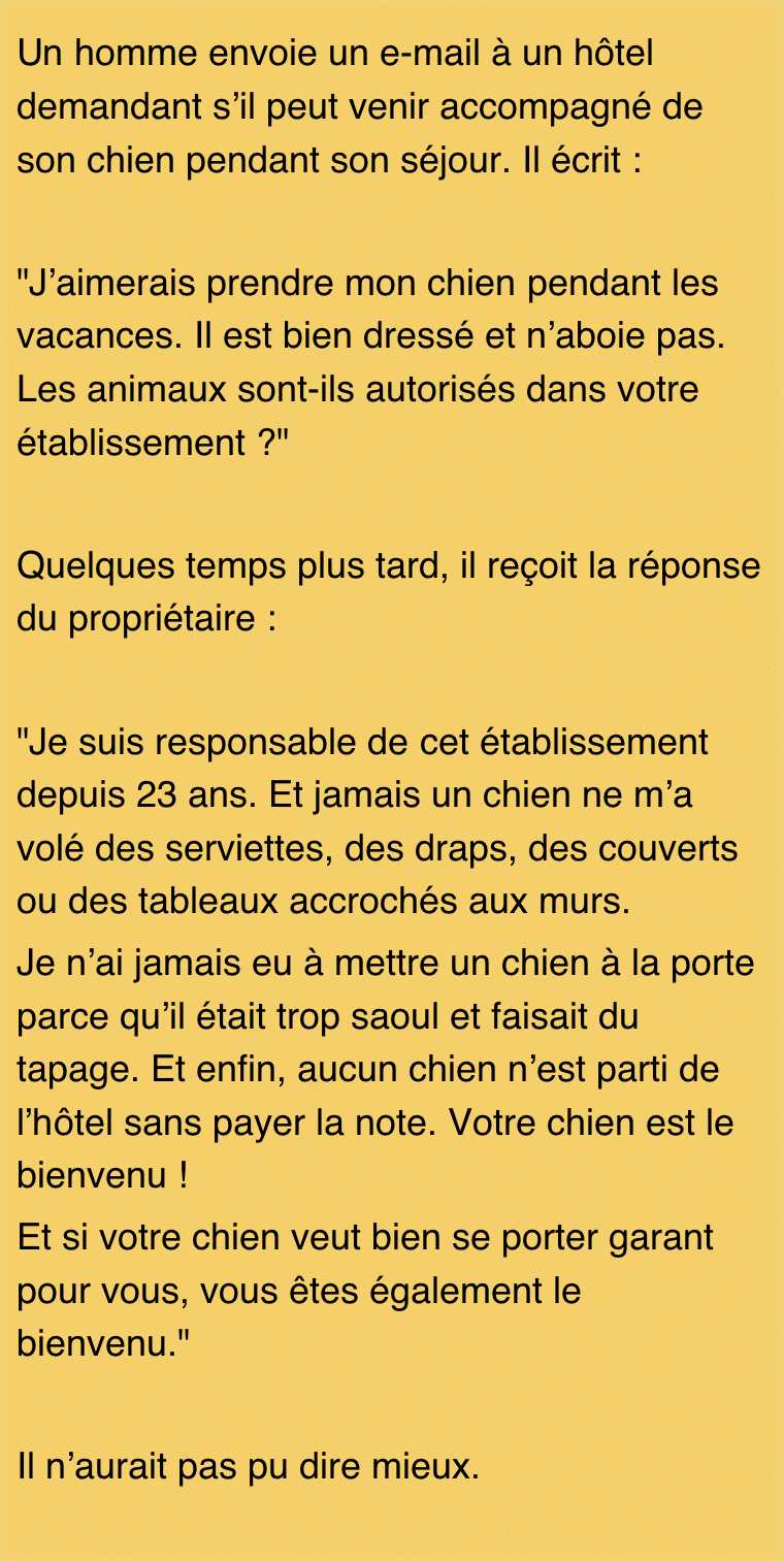 A l’approche des vacances, un homme prévoit de séjourner dans un hôtel. Il envoie un email à l’établissement pour savoir s’il pourrait éventuellement venir avec son compagnon à quatre pattes.