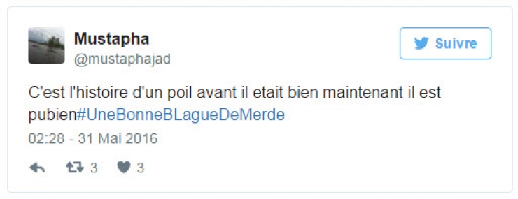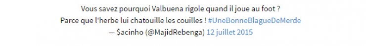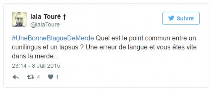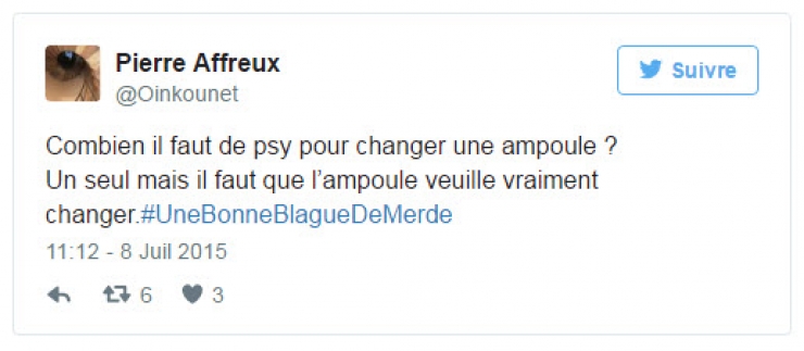 Sur Twitter, via le hashtag #UneBonneBlagueDeMerde, les internautes n’arrêtent pas de partager des blagues cocasses. Chacun s'y retrouve dans les différentes catégories : que ce soit de l'humour noir, des blagues à caractère sexuel, des monsieur/madame et bien d'autres encore.