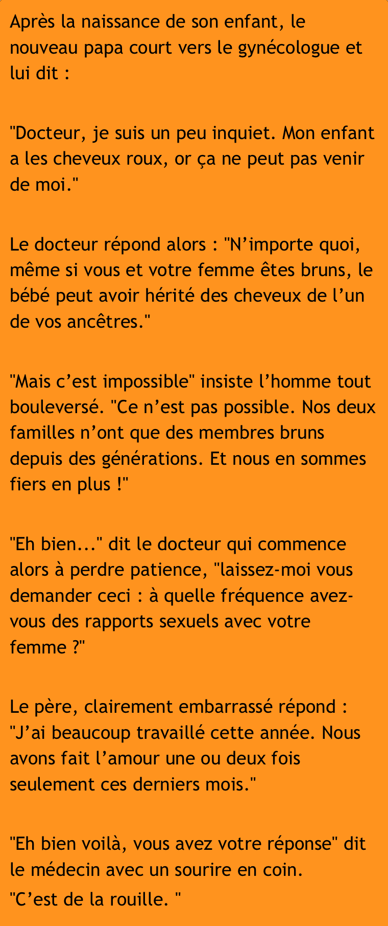 Un mari doutant de la fidélité de sa femme, se rend chez le gynécologue afin d’en avoir le cœur net. Sauf que, ce dernier, voulant détendre l’atmosphère (ou pas), répond à ces questions d’une manière très drôle.