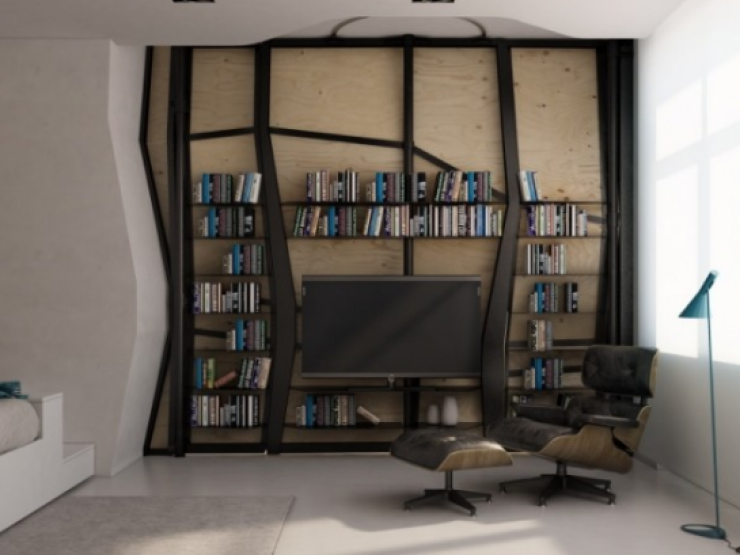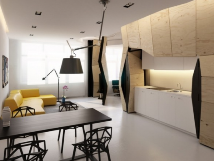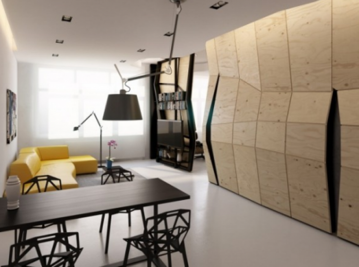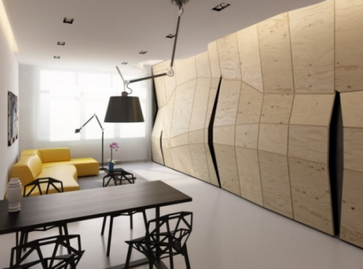 Il s'agit d'un concept de logement modulable fort intéressant. Son élément principal est un mur dont les panneaux en bois peuvent être manipulés à souhait, de manière à personnaliser l'organisation de votre intérieur. Ils peuvent, en effet, être déplacés et retournés de différentes façons.