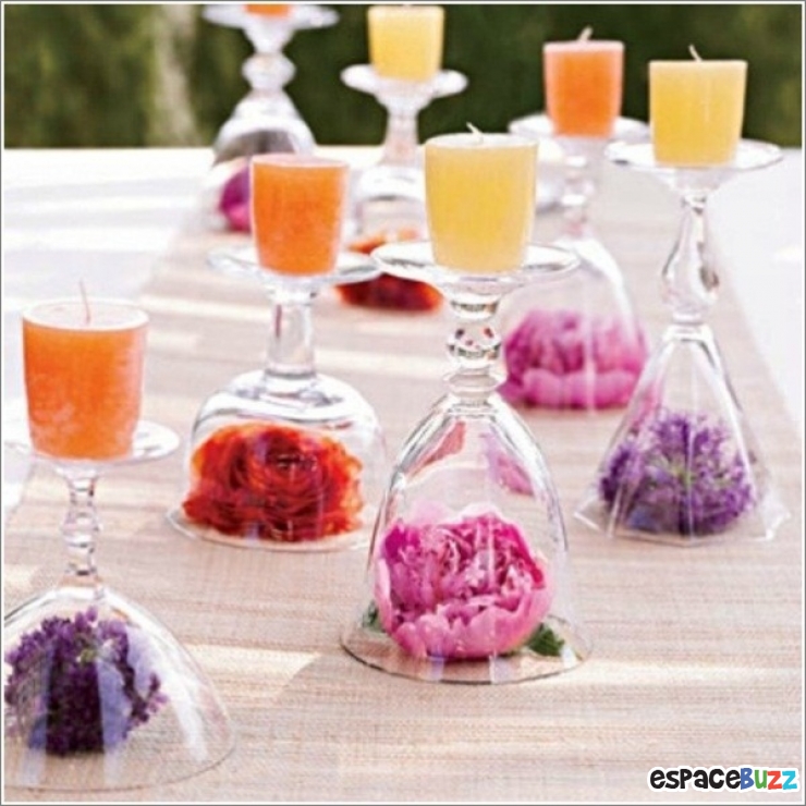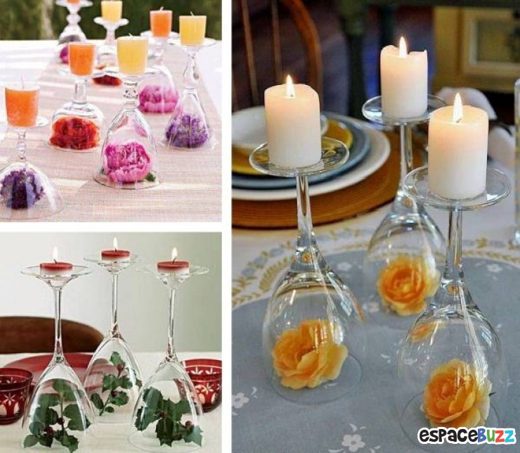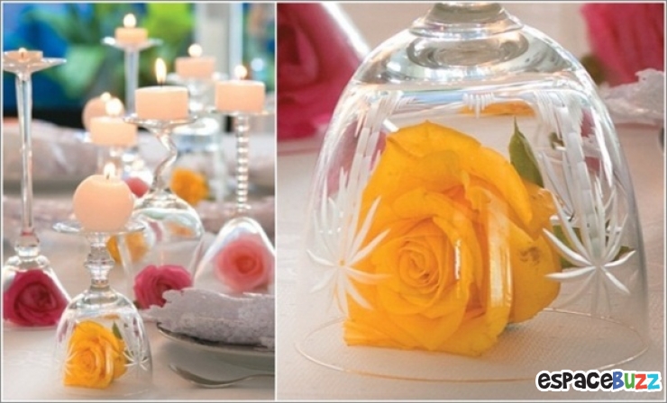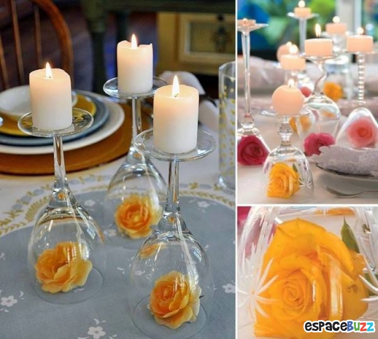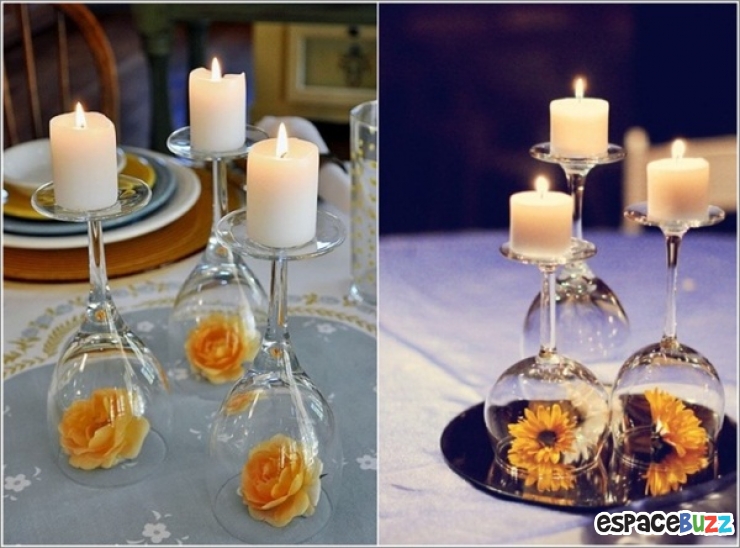 Pour ces décorations vous n'aurez besoin que de verres de vin, de bougies, de fleurs et d'imagination.