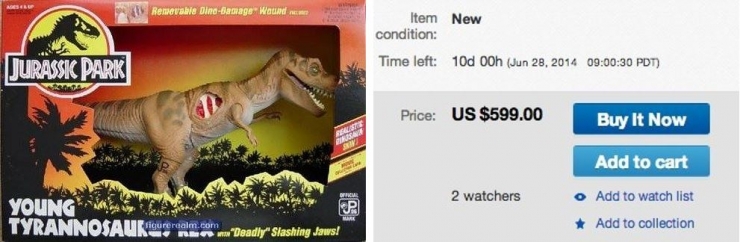 Et oui, avec la sortie du film Jurassic Park au début des années 90, nous avions tous au moins un T-shirt ou un bonnet à l'effigie de ce magnifique film de Steven Spielberg. Mais les plus grands fan d'entre nous ont peut-être eu LA figurine Jurassic Park. Pour cela, sachez que si vous l'avez gardez en état avec la boîte, vous pouvez obtenir 500 € en la mettant sur eBay. Seulement si vous voulez la vendre, parce que c'est tellement collector que d'ici quelques années elle vaudra peut-être plus, qui sait ?